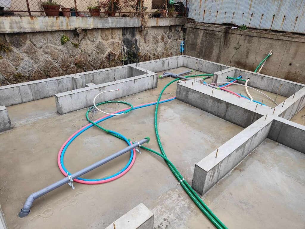 名古屋市港区の新築工事にて、配管工事を行いました。 写真は施工中の配管の様子と、設置完了後の住宅設備です。 床下で見えなくなる配管こそ、美しく、正確に。