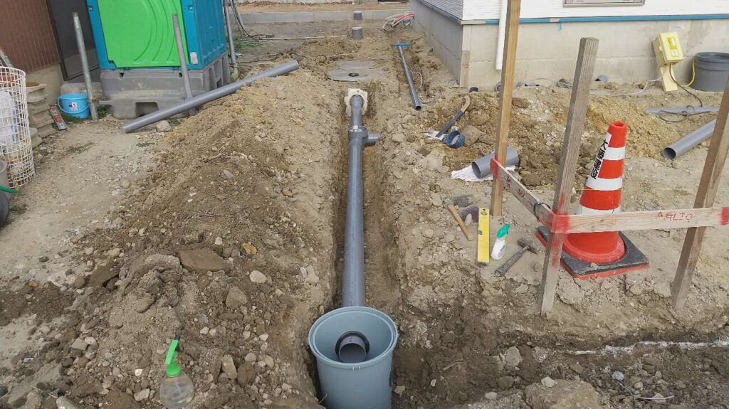 蟹江町で新築工事。 外回りの配管をきっちり埋設し、室内には器具を設置しました。